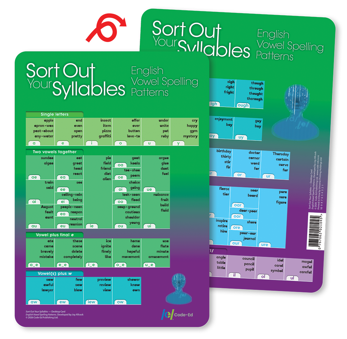 Five sets of sorting cards and labels are included with the programme. Students work together in small groups to sort these cards, to create a system for understanding and recognising the vowel patterns that occur in syllables.