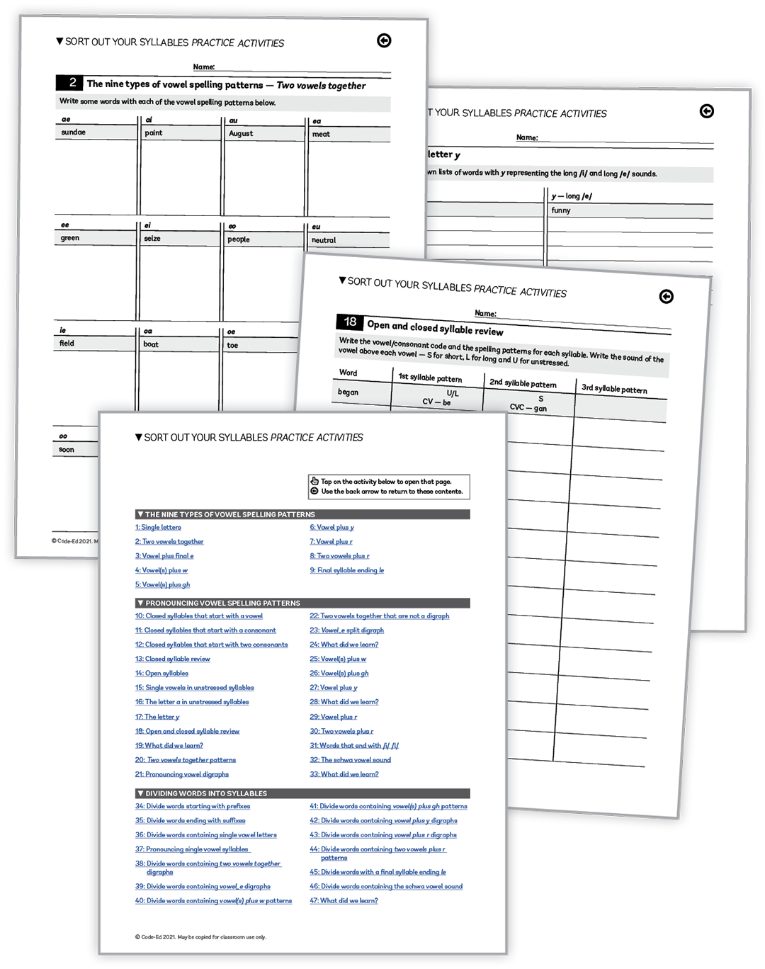 The cornerstone of Sort Out Your Syllables is the Teacher's Resource Book. It includes 50 carefully sequenced 10-minute lessons that teach students to: